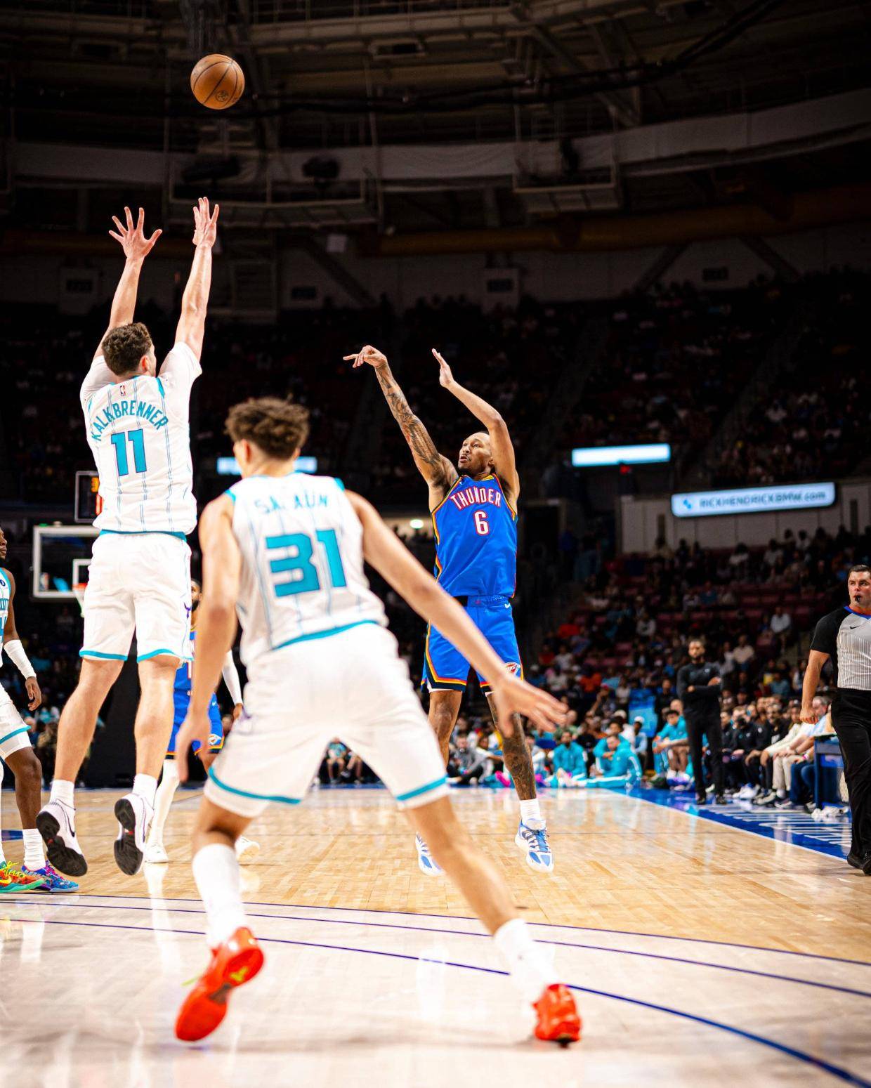 第二节,黄蜂在小节初期努力缩小分差,最小将比分追至34-38。此后,雷霆发起一波攻击,再度将领先优势扩大至13分。尽管黄蜂在小节后半段努力反扑,再次将比分迫近,但整节结束时,雷霆依旧保持领先,以70-57进入下一个阶段。