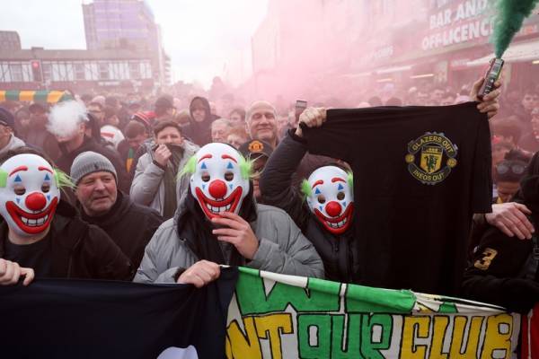 2026年2月1日,英国大曼彻斯特郡曼彻斯特市:数千名球迷在老特拉福德球场外抗议格雷泽家族和吉姆·拉特克利夫爵士对曼联的所有权,事件发生在曼联对阵富勒姆的比赛前。IC Photo